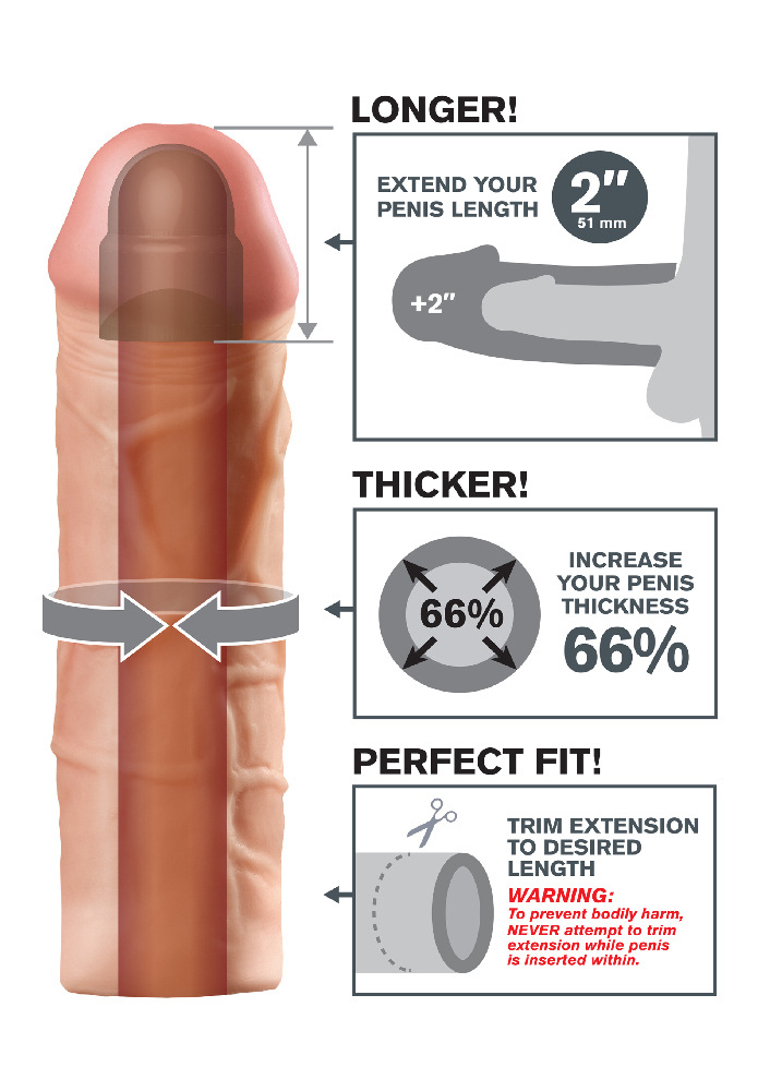 Turn your penis into an instant pleasure machine with the incredible Fantasy X-tensions. Now you can be all the man you can be and satisfy your partner with this easy-to-use erection enhancer. Developed as a safe, affordable, non-surgical alternative to expensive medical procedures and pills, your Fantasy X-tension will give you the biggest, thickest, most satisfying pleasure rod you ever imagined! Perfect for men with ED and midway performance problems, your new enhancer will deliver results that both partners will love! The Perfect 2` Extension is a customizable extension that can be easily trimmed at the base for a perfect fit. It`s super-stretchy to accommodate most sizes and snug enough to help you last longer. Your partner will enjoy deeper penetration with the 2` extension at the tip, while the ultra-lifelike shaft makes you 33% thicker all around. The soft Fanta Flesh material feels just like a second skin, giving you the length, girth, and confidence you need to satisfy your lover. One size fits most. This is not a condom.